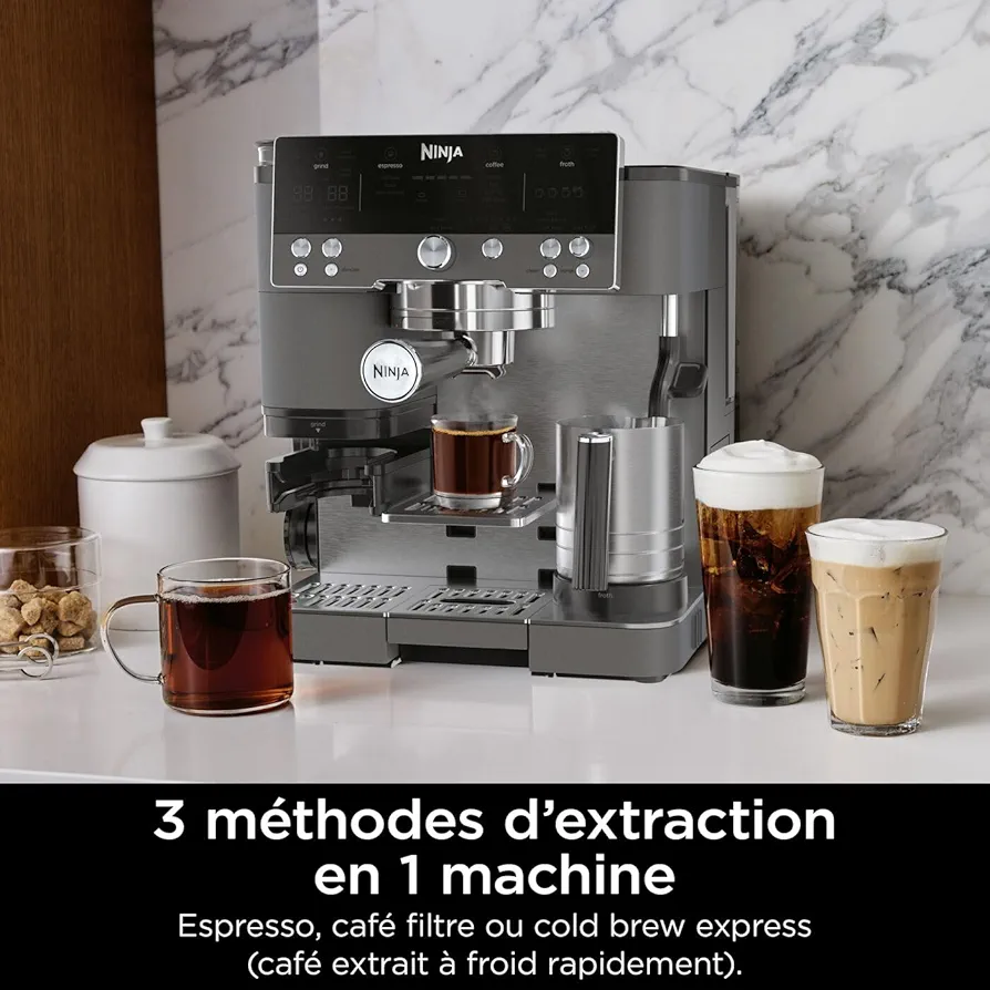 EXCLUSIVITÉ AMAZON : Gris Métalisé. 3 MACHINES EN 1 : savourez vos cafés préférés à la maison avec cette machine à espresso, à infusion à froid et à café filtre 3-en-1. Elle inclut également un broyeur à grains, un mousseur à lait et un porte-filtre