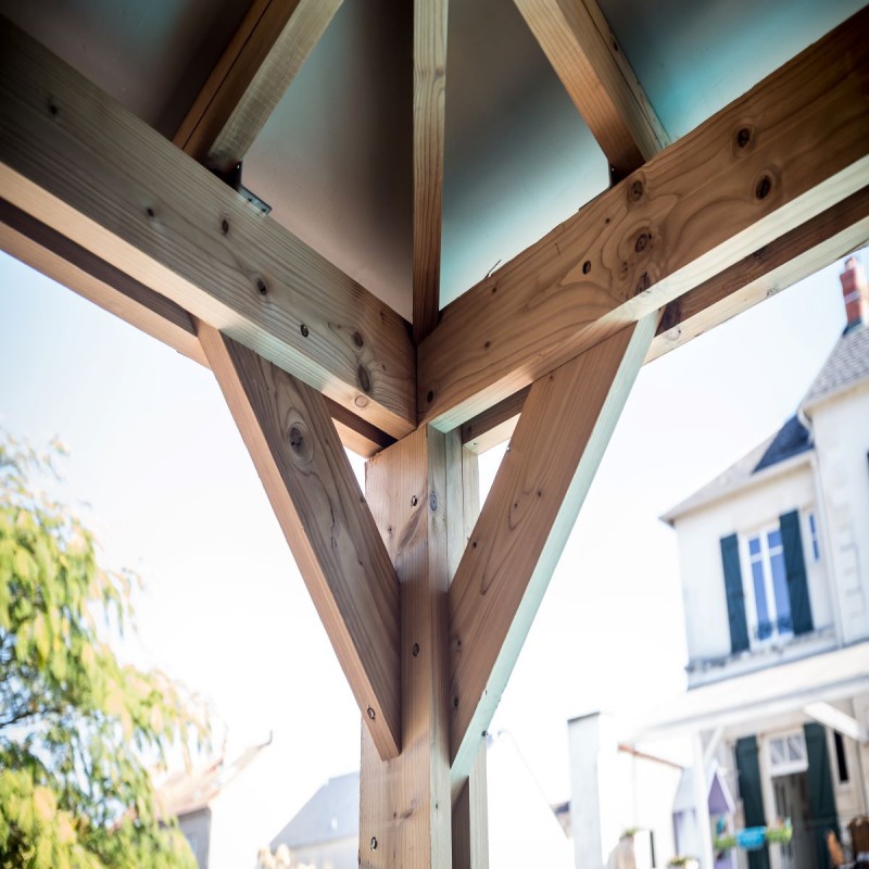 . Structure : 4 poteaux en épicéa thermo chauffé moisé section 14x12cm, livrés avec platines métalliques à fixer au sol dur ; charpente en épicéa thermo chauffé
